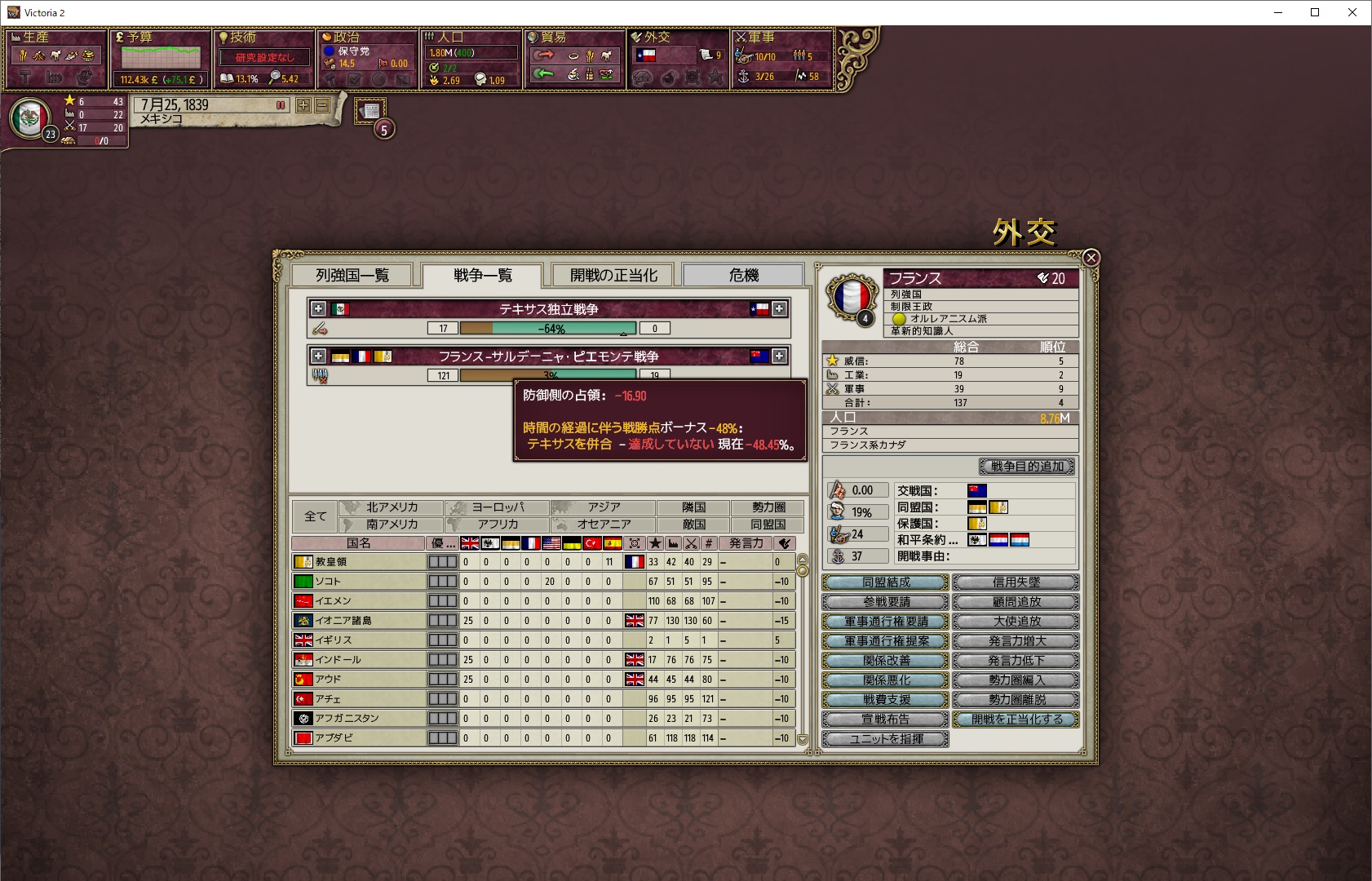 あと、注意が必要なのは戦勝点が-100%まで行くと無条件白紙和平となるため、-80%を超えたあたりからはテキサス軍撃破や被占領地の開放(よりはテキサス領占領)をしていく必要がある。