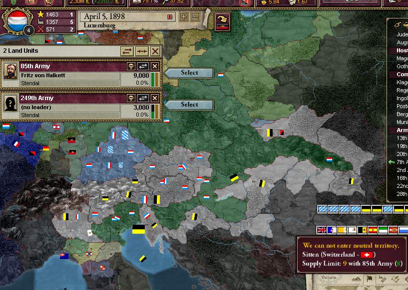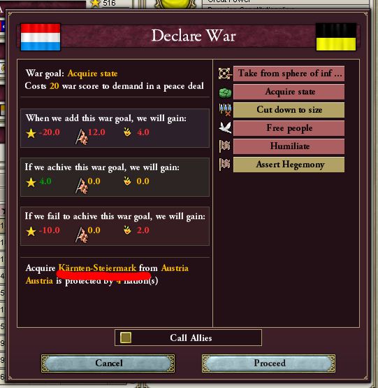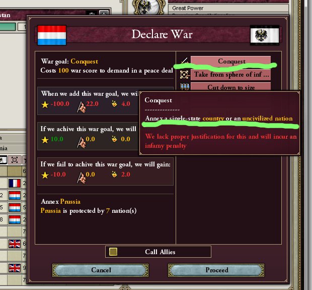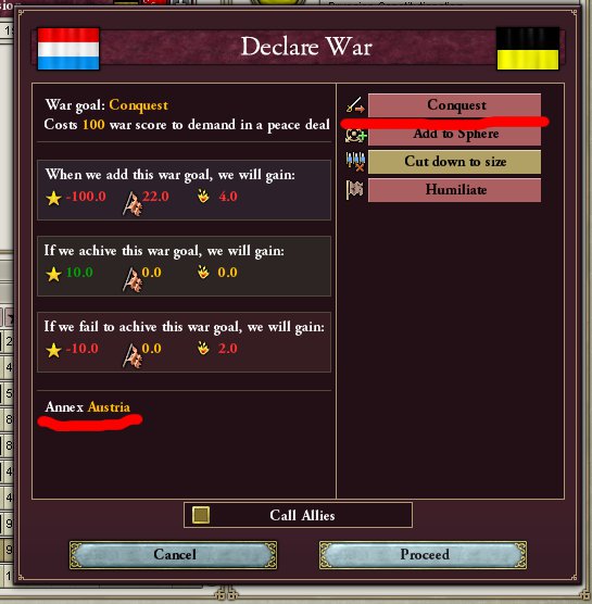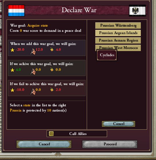 プロイセンも残るはBrandenburgのみになっておるではないか。そろそろ我がルクセンブルクの領土になる覚悟もできていることだろう。Conquestで宣戦布告せよ。
