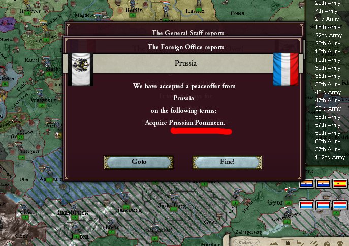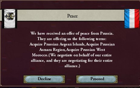 うむ。宣戦、勝利条件追加、和平で外交点を4~5点は使う事になるからな。とりあえず、理由は忘れたがPoemmnを取ってプロイセンとは和平することにした。