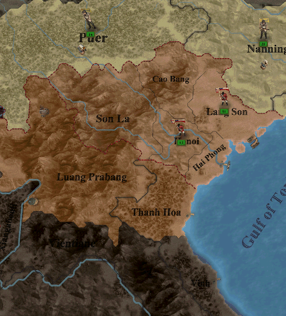 宣戦布告と同時に我が国の部隊はダイナムへ上陸を開始しました。ダイナムはすでに中南部のVinhlong州およびThanh Hoa州がオランダの植民地となっており、北部のCao Bang州のみの1ステート国家となっているので、今回の戦争目的は保護国化です。