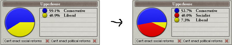 選挙戦が1月1日に終了し、上院は相変わらず保守主義者が100%を占めていますが、下院では、議席配分は、保守党が29.3%、急進党が19.6%、国粋主義党が18.2%、自由党が17.4%、社会党が15.6%となり、保守党・国粋主義党の連合は47.5%で過半数を割ってしまいました。しかし、保守党・国粋主義党の連合が第1会派なので、首班は保守党から指名されました。