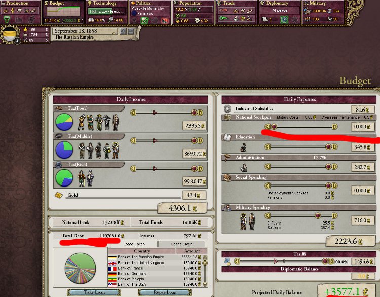 直らないので予算の国家備蓄もゼロにしていっきに借金を返す。ロシアは軍事点がオーストリアについて下から2番目なので、不意打ちで宣戦される心配はがないし。……と言っても、今まで、戦争が本当に不意打ちで始まったことなどなかったのだけど。