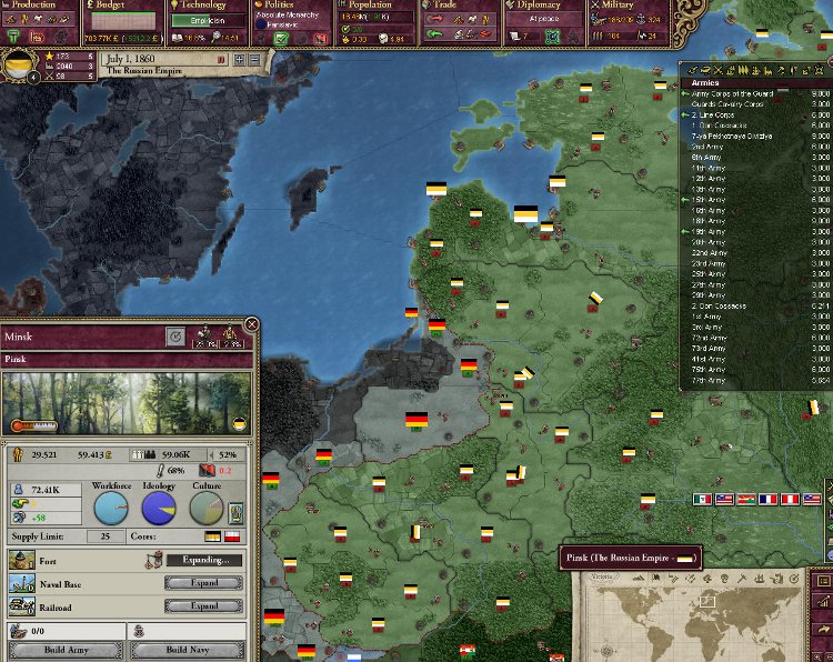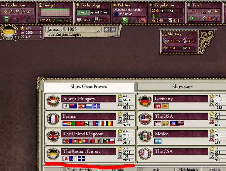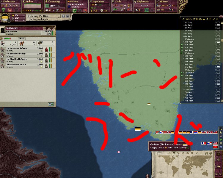 ランクは4位だが工業点2308点、そして軍事点131点はどう考えても大国の割りには伸びていない。実際の師団数は263師団+総動員で161師団だが、ドイツ、オーストリアはともに500師団以上、イギリスは800師団にもなっていて、ロシアは軍事大国としての陰もなくなってしまっている。まあ、お陰で宣戦されないんだけど……。