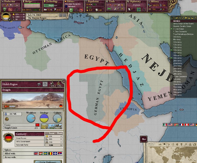 もうひとつは、ドイツのエジプト獲得について。ドイツのエジプト殖民拠点獲得については許可していたのだが、ドイツは「殖民拠点として左下だけ」と言っていたのに、いざ終わってみたら海への出口も含めて2ステート獲得していたのだ!! これはロシアとしても聞いていない。いや、列強は一カ国も聞いていなかった。