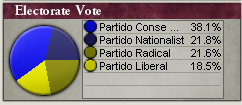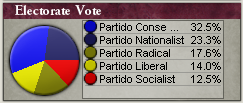 ところで、上院は相変わらず保守主義者が100%を占めていますが、下院では社会党(Partido Socialist)という新党が出現しました。社会党には赤い丸がついています。議席配分は、保守党が37.8%、急進党が20.0%、国粋主義党が19.7%、自由党が12.6%、社会党が10.0%となっています。