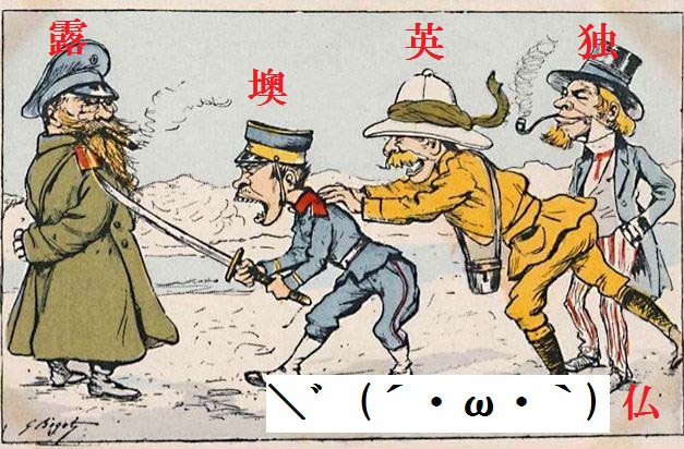 そうなるわね。オーストリアは参戦表明したし、オスマンは親仏中立、イタリアは最初からフランスと中立(その返礼としてイタリア内の旧オーストリア領の不問を主張、もとい中立条約を結んでいてなおかつ順位も低いイタリアに興味はない)、おまけにロシアはUSAと日本のコアも踏んでるし、南米2国はイギリスの勢力下。そして、イギリスとは中立条約を結んでいるので、イギリスが裏切る可能性は低い。総合的に判断した結果ね。