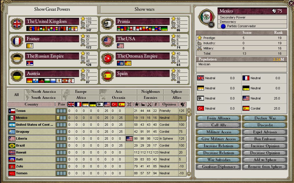 ちなみに征服プレイなら貧乏くさいメキシコはすっ飛ばして中米連合・コロンビアあたりから食うのがいいかも?