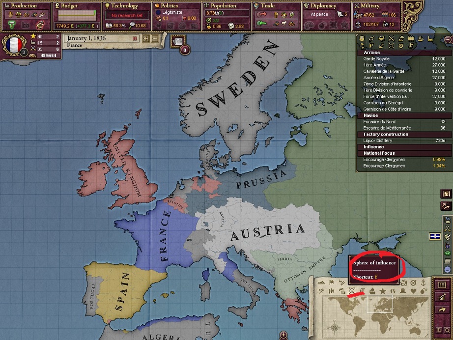 メイン画面の右下の赤で囲ってあるアイコンをクリックすると列強と勢力圏のマップに切り替わります。青がフランス、赤がイギリス、白がオーストリア、緑がロシア、紺色がプロイセン、黄色がスペインそして黄緑がオスマンです。今のフランスはイタリア中部にある教皇領を勢力圏として保持していますね。
