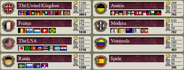 ちなみに、英国、USA、ベネズエラで政権交代があり、英国では国粋主義党(Nationalist Party)という反動主義政党が、USAでは共和党(Republican Party)という自由主義政党が、ベネズエラではLiberal Restaurador(自由再興党)という別の自由主義政党が政権与党となりました。