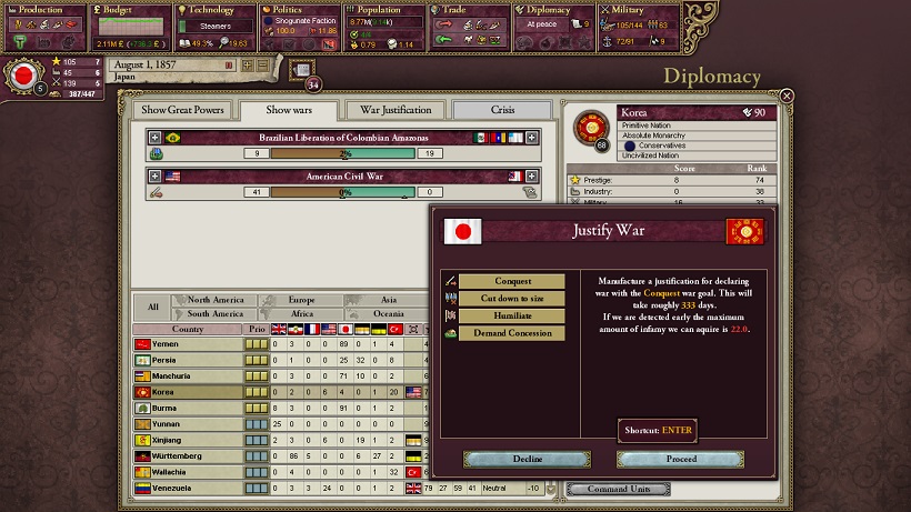 わが国は直ちに征服での開戦自由作成を実行します。