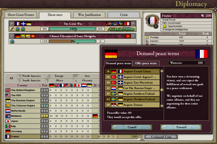 んー。WarScore50からがキツイんだよね。占領が必要になってくるから。それに、露仏はまだ710も戦力を持ってる。どこに隠してるんだろ、マダガスカル?