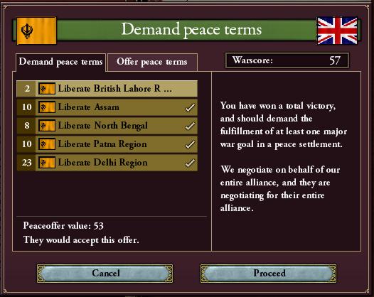 Lahore Regionを諦めてAssam、North Bengal、Panta Region、Delhi Regionを解放。
