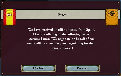 SpainはAustriaやOttomanと共にRussiaと戦争中、早速Luzonの割譲を求めて宣戦。