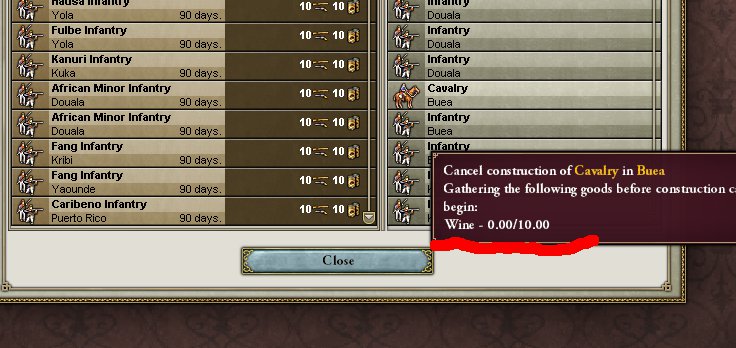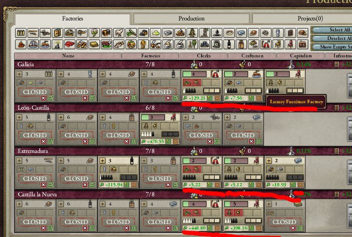 しかし、プレイヤー国家であるスペイン、スカンジナビア、オランダ、日本すべてが一気に生産品目を変えたため、市場への悪影響も出始めた。高級品の需要はまだまだ余裕があるが、ワイン、蒸留酒といった酒類が全く買えない……。「おいおい誰か作れよ、自分は作らないけど」な状態。AI国家は今まで通りなので列強上位には行き渡るだろうが、スペインも含めたプレイヤー各国は騎兵、砲兵、近衛兵など酒類を使うユニットが全く作れなくなる。さらには、高級品の材料となる家具や衣類も市場から枯渇し始める。対策として重要資源は2000まで買い込む設定にすることで、列強下位は更に買えなくなる……。こ れ は ひ ど い 。