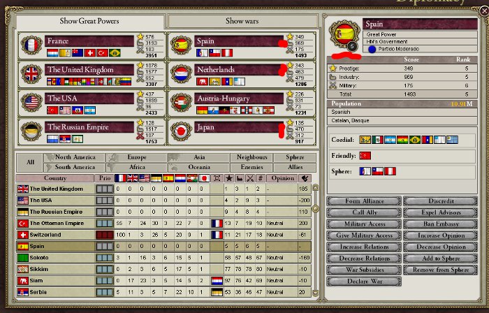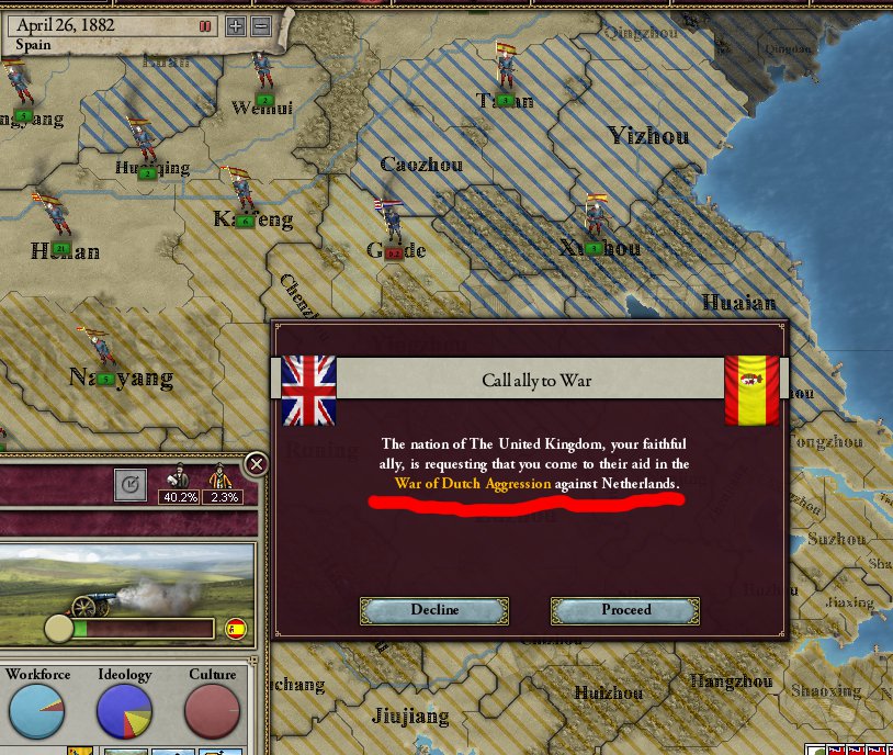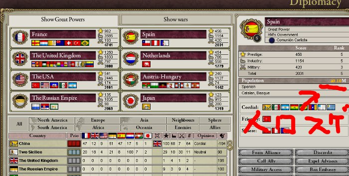 さて、欧州国家で対中戦を始めるのは今回が初めてだが、オランダ、スカンジナビア、日本に対しても公言していて、一緒に攻める同志を探しておいた。各国とも怖いのは英国の介入だが、幸いにもスペインと英国は同盟関係にある。しかも、なんと中国と英国との同盟関係が切れてると来たもんだ(勢力圏はそのまま)。