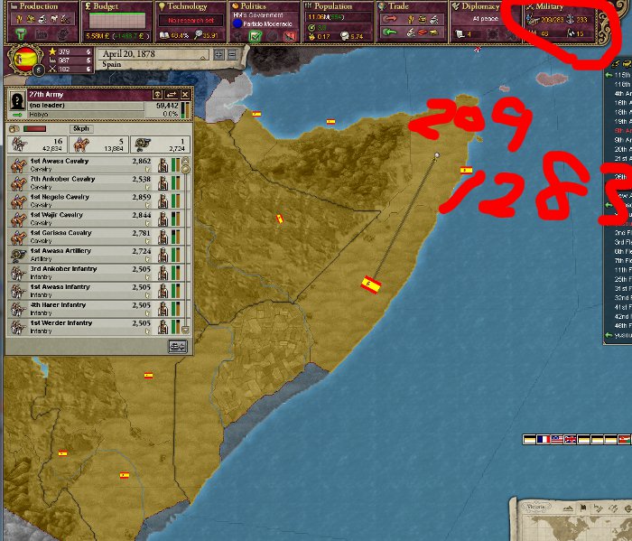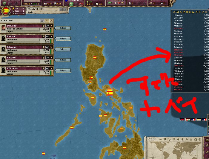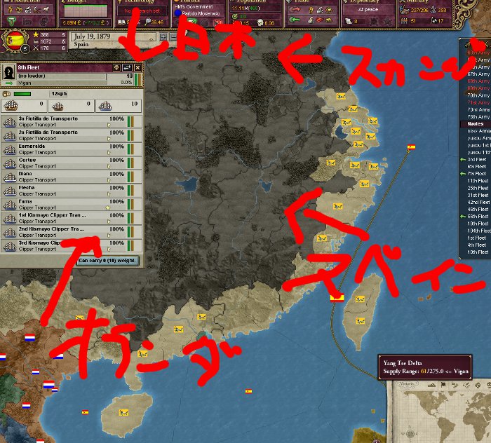 そんな混乱の最中、スペインは次なる戦略へと動きを始める。オストプロイセンの飛び地、スペイン本国、両シチリア、アフリカの各地とフィリピンの間で輸送船を往復させて……ええい足りないと輸送船を50隻くらい増産して……フィリピンへと送る。ちなみに、対仏戦時点でのユニット数は150程度だが、作成可能限界の260近くまで連続生産済み。順調に殖民を続けているアフリカが想像以上に兵力を生んでくれている。本当は騎兵や砲兵ももっと作る筈だったんだけど酒類が買えない(汗