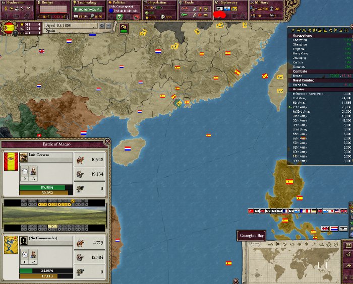 それが原因か、スペインが戦い、10プロヴィンス程度占領が完了したしたところで悲劇が……。なんと、戦争の盟主・イギリスが中国と勝手に和平。Wenzhouはもらえてないのに……? おいおいふざけんなよ。