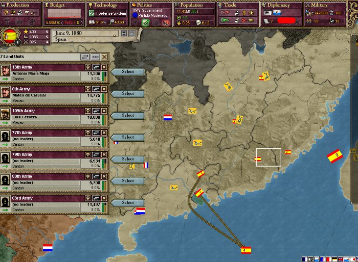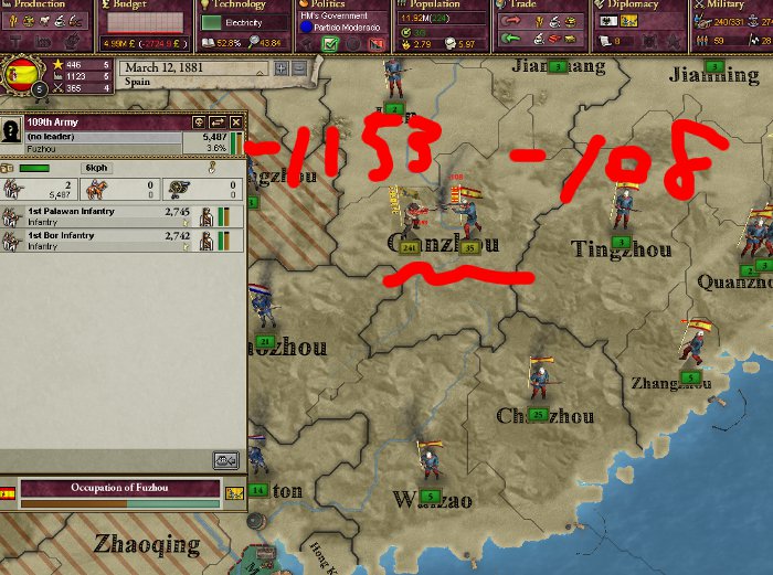さて、突然休戦を申しつけられて、狙った領土も得られず、Infamyもしっかり上がっているスペインは納得がいく筈もない。陸軍をすべて輸送船へと引き上げさせると、和平を無視して1880年10月、再び中国に宣戦。今度は単独で。先ほどと同じくWenzhouを要求しておく。