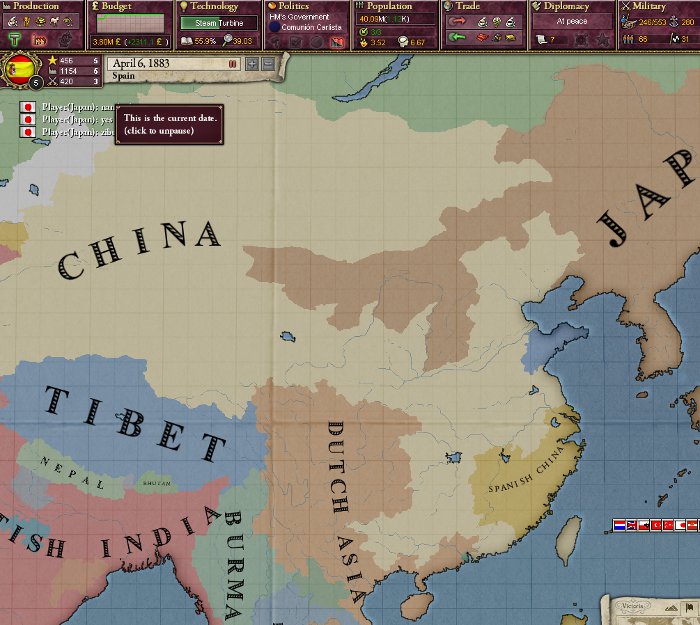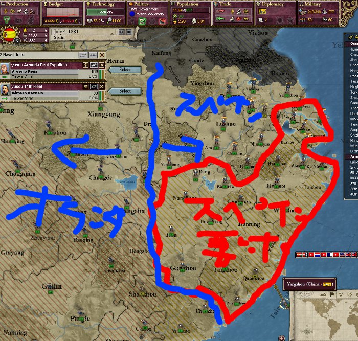 ちなみに、スペインのInfamyは遂に0になったので、戦勝点の許す限り中国の土地は計算上は最大6個まで取れる。最初に宣戦してリスクを取る自分は人口最密集地帯のWenzhouから上陸を始め、中国中部を一気に食い破る。同時参戦を表明したオランダはアンナンから陸続きで侵攻できる状態なので、南から土地を取っていくことを考慮の上だ。スカンジナビアには北京の南東に当たるDamingを取ってもらう(ここは人口もそれなりに多く、貴金属の出るChaozouがあるので結構オイシイ)。Japanは和平が残ってるから待ってと言っていたけど、先に食い荒らしていたせいなので気にしない。日本はスペインに対しても好戦的だし。
