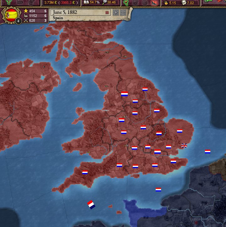 スペインとイギリスの友好関係は、ここでもプラスに働いた。なかなか折れないイギリスに対して、オランダはイギリス本土への上陸作戦を計画。本土兵力は同盟相手の兵備は筒抜けなので、すべて教えてしまう。本土には兵力はおらず、海軍もいない。