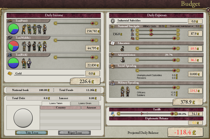 予算は戦争を始めるまではこんな感じかな? お金は節約しないとなんでね! 戦争が始まる50~60日前に陸軍予算は100%に戻すといいよ。ちなみに、Controlを押しながら両端の▲を押すとすぐMax・Minになるよ。Shiftを押しながらなら10%きざみ。知ってると便利。特にProjectへの投資のときはね!