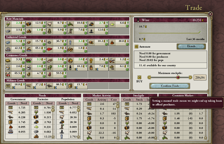 どのユニットに何が必要かをあらかじめ調べておくといいよ。わたしは基本的に歩兵と砲兵、竜騎兵の3つしかつくらないからこれでいいんだけどね。歩兵は缶詰10と小銃10。砲兵はワイン10と蒸留酒10と大砲10と缶詰10。竜騎兵は缶詰10と小銃10とワイン10。