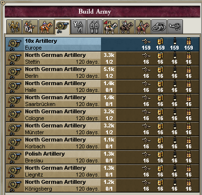 (2x)とかの複数のユニットが作成可能なプロビは、作成期間が短いユニットを2つつくるのがいいよ。この場合は歩兵だね。あと、できれば人口が多いプロビで竜騎兵、少ないプロビで砲兵かな。