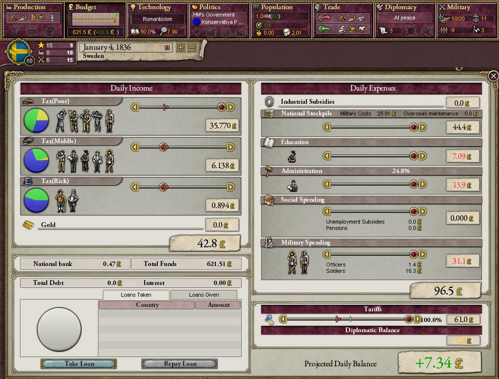 仕方なく貧民の税率と国防予算を100%にして農民の兵士POP転換を促し、限度いっぱい7個師団の歩兵を発注。これでも17個師団が精一杯だ。