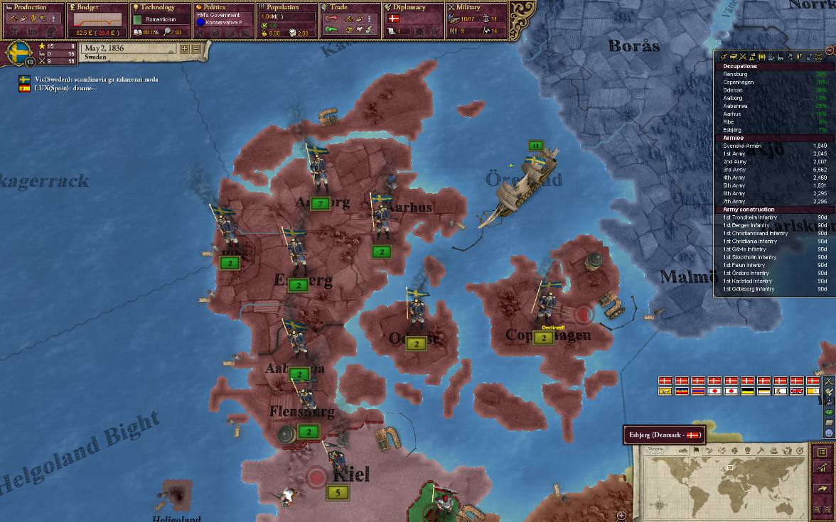 プロイセンにデンマークを取られるとスカンディナビア化できなくなるので、こちらも急いで宣戦。