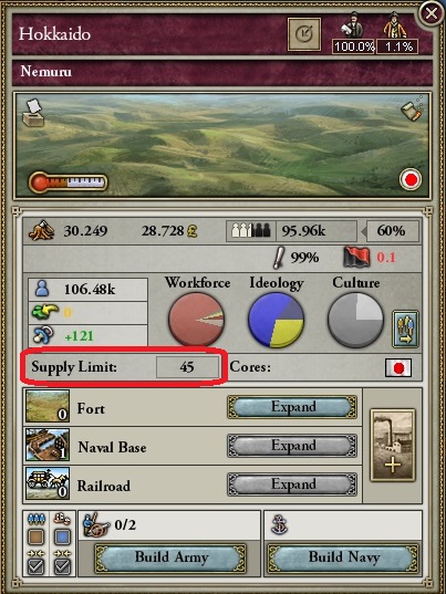 プロビに設定された数値を超える軍隊を駐留させると、補給ができないために兵力がその限界まで減少していきます。この補給限界は地形によって違い、平坦な地形ほど高く、自然環境が過酷な地形ほど低くなります。このため、補給限界は軍隊の規模を制限しますが、一般的には平原の補給限界をもとに構成しておけばよいでしょう。