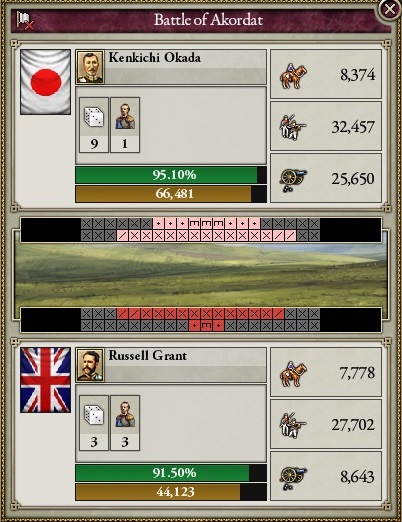 - Organization:組織率です。軍隊がその秩序を維持して戦闘を続行するための能力で、軍団の緑色のバーで示されます。これが0%になると自動的に戦闘は敗北となります。軍隊の死傷者と一致するわけではなく、死傷者は多いが組織率は高いまま、とか、死傷者は少ないのに組織率はボロボロ、といったこともあります。ユニットによって最大値が違っており、近衛兵のような上位のユニットは高く(当然、打たれ強い)、非正規兵のような下位のユニットは低くなっています。BudgetのNationalStockpileにかける予算を減らすとその分だけ組織率は低下します。