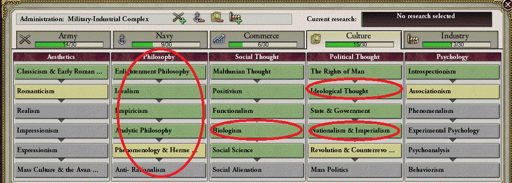 ○Social Thought(左から3列目)は教育効率=研究点=同化率に大きな影響を与える。さらに植民地への移民も増加するので、移民&同化のコンボも狙えておいしい。特に赤枠で囲ったBiologismには派生効果で教育効率50%があるので、最低でもここまでは研究しよう。