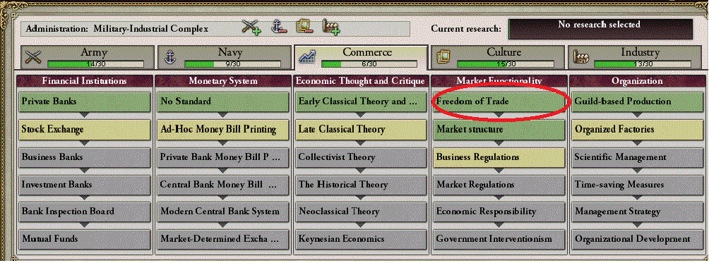 ○Freedom of Tradeは最低ランクの技術の癖にRGO縮小効果=工業化促進と50%のRGO収入アップがある。ぜひやるべき。高級服工場の条件にもなっているので、むしろこれをやるのはこのゲームをやる人の義務。