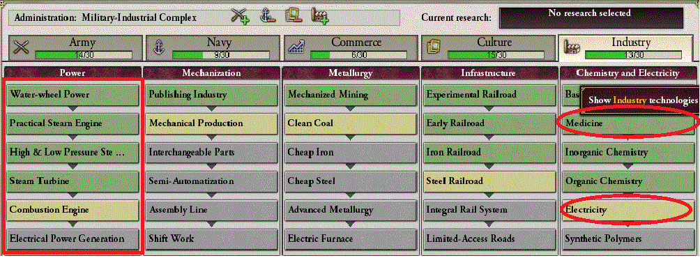 ○Chemistry and Electricity(一番右)は兵士の補給率に著しい影響を与える。大軍を動因する為には必須の技術となるし、灼熱のアフリカ大陸を侵略する際にこれを研究していないと凄まじい勢いで自軍が消耗してしまう。大切なこの列研究だが、特に大切なのが、赤で囲ったMedicine と Electricityだ。両方とも、人口増加にブーストがかかるんだぜ!人口は正義です。あと、Electricityは発明は電気部品つくるのにも必須だし、その上の研究で燃料工場が解禁される。とても重要。