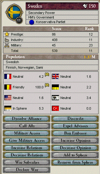 ロシア・ベルギーを始めとして各国に占領されるスウェーデン。 今回、ベルギーはほとんど戦闘をしていない。初心者はこのように同盟国を誘って戦争しよう。