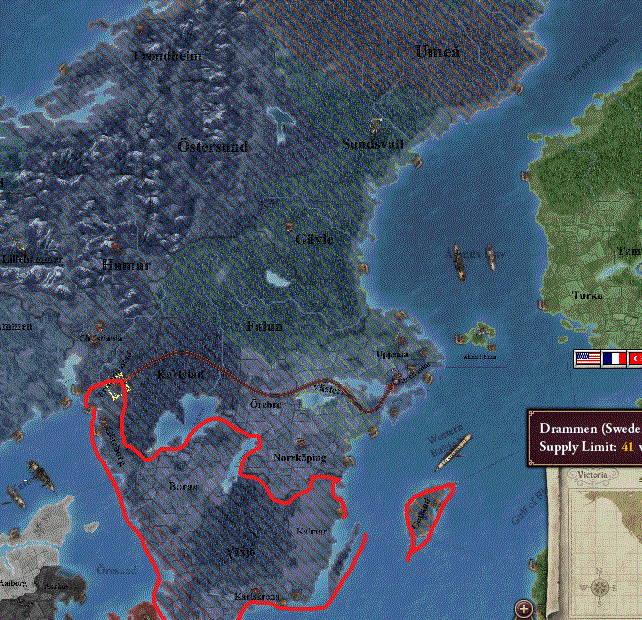 で、ロシア、バイエルン、ポルトガル、デンマーク、オランダと同盟しスウェーデンにゴットランドを要求し宣戦。ゴットランドはスウェーデンの右下。ちなみに対するスウェーデンは単独なので、勝敗は誰の目にも明らかであった。