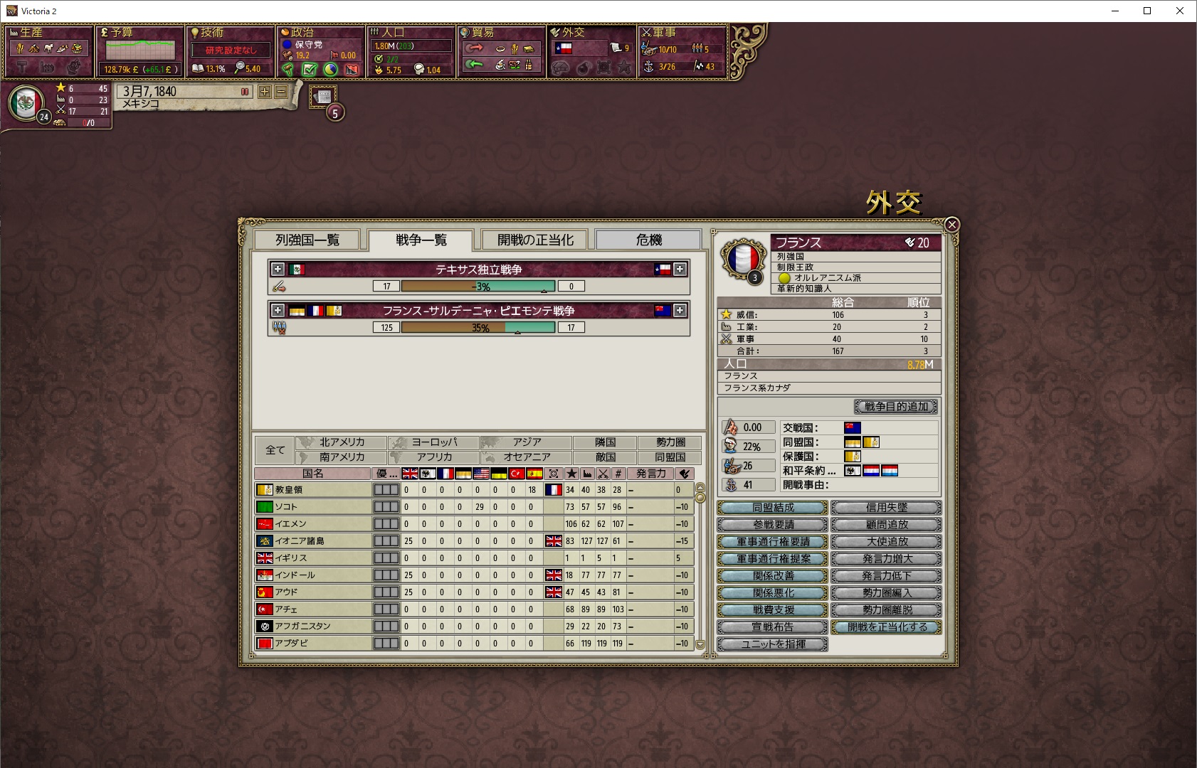 あと、注意が必要なのは戦勝点が-100%まで行くと無条件白紙和平となるため、-80%を超えたあたりからはテキサス軍撃破や被占領地の開放(よりはテキサス領占領)をしていく必要がある。