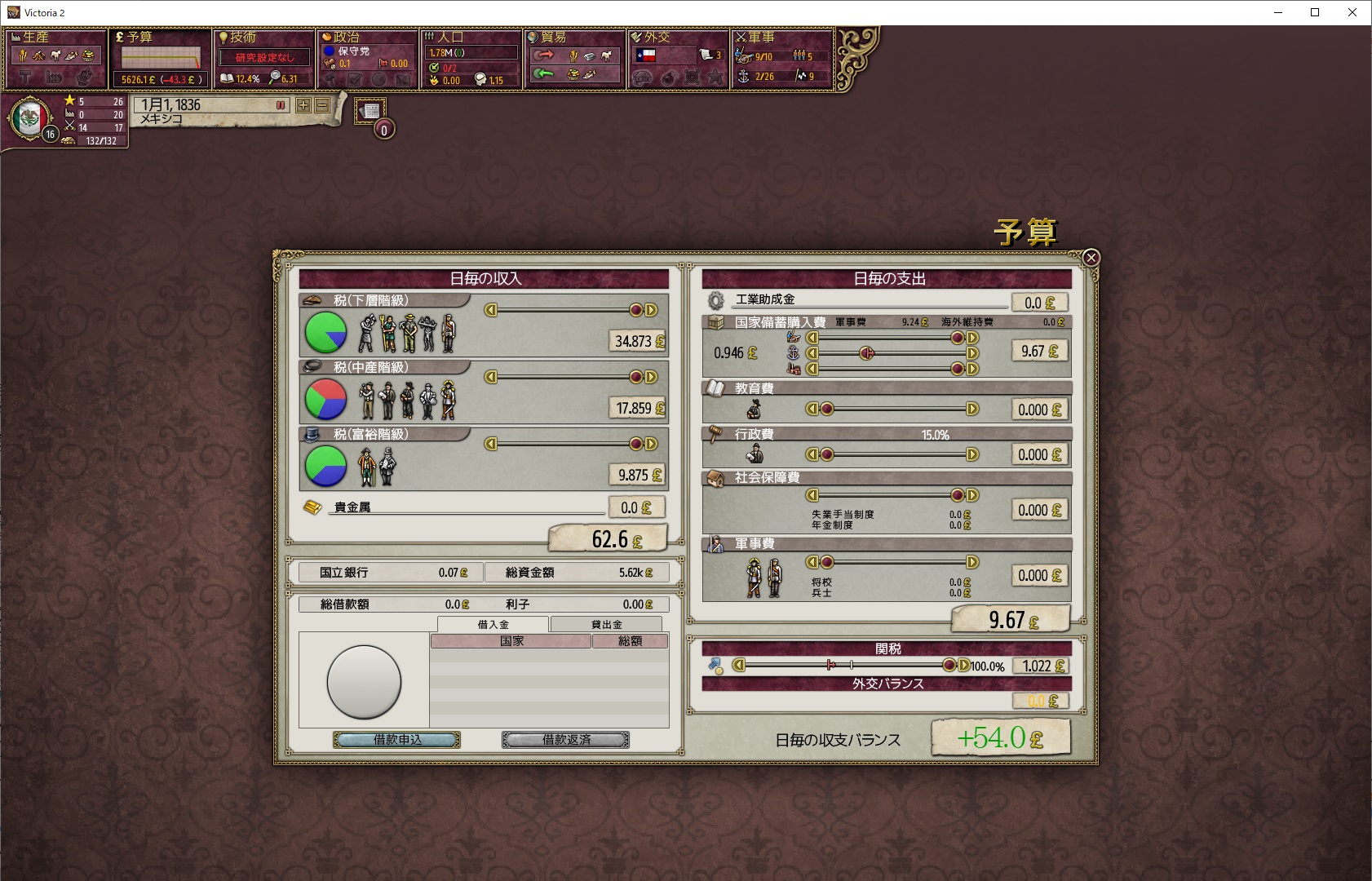 メキシコは人口多い&RGO優秀&not自由放任という好条件のため、財政的には非常に余裕がある。