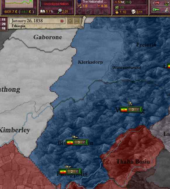 ソコトの周辺の未入植地域に部隊を移動。ソコトは列強のアフリカ植民の足掛かりになるので、あらかじめ併合しておきます。工業化に必要な石炭も採れるので一石二鳥ですしね