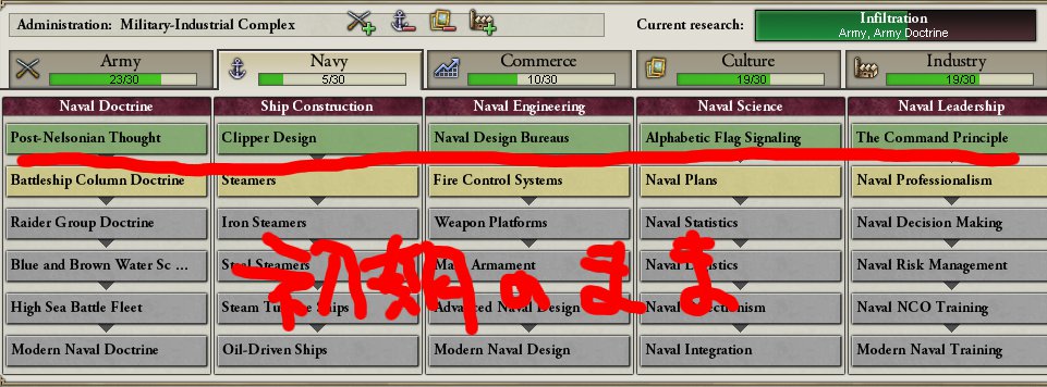 我が国は建国以来、高い識字率を背景に技術大国をひた走っておる。途中の順番は反省すべきものがあった気もするが、研究点の高さですべてカバーしてしまっていて、結果として見せるほどの特徴はないな。1900年時点では工業・陸軍・文化は充実、商業手抜きといったところだ。ただ、バージョン1.2リリース直後のノウハウのないなかで進めていたせいで、1900年を過ぎても海軍を研究していないのは少々問題かもしれないな。