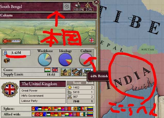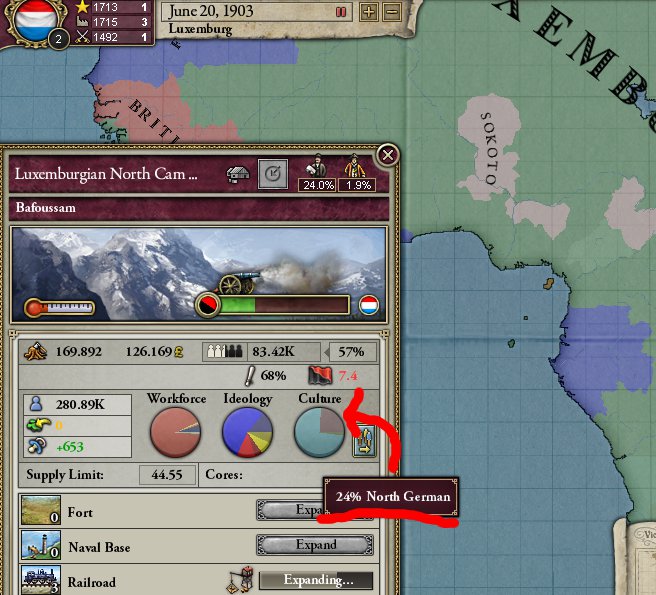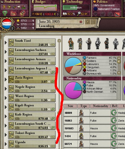プレイしていた当時はステート化の方法を知らなかったからだな。官僚NFでステート化する方法知ったのは、正直マルチ始めてからだ。1.4βになって植民地のPOPは非常に兵士になりにくくなってたので、これを機にステート化を進めないとな。