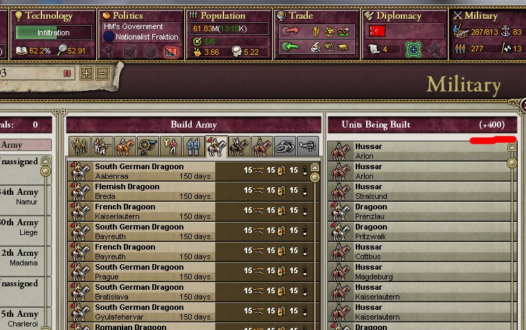 我が軍の軍事力はというと現在287師団。最大作成数は813師団なのでだいぶ余裕があるが、これはプロイセン・オーストリア併合で増えた分というのがほとんどだ。あとは、先の大戦でも活躍した総動員兵も相当数出せる。