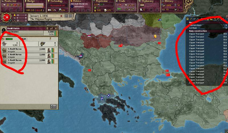 最序盤はプレイヤー中最上位の列強7位スタートという立ち位置を活かして、小火器と帆船を100まで買い込む設定でスタート。オスマントルコの初期軍隊は非正規兵が含まれ、近代化が急務な上に、トリポリと交戦中、すぐに戦争があるのに輸送船が3隻しかない。マルチの世界市場では上位のプレイヤー国が商品を買い占う=下位は買えないという事態に直結する。かくして最序盤の輸送船購入競争に勝ち、次々と輸送船の生産が始まっていく。
