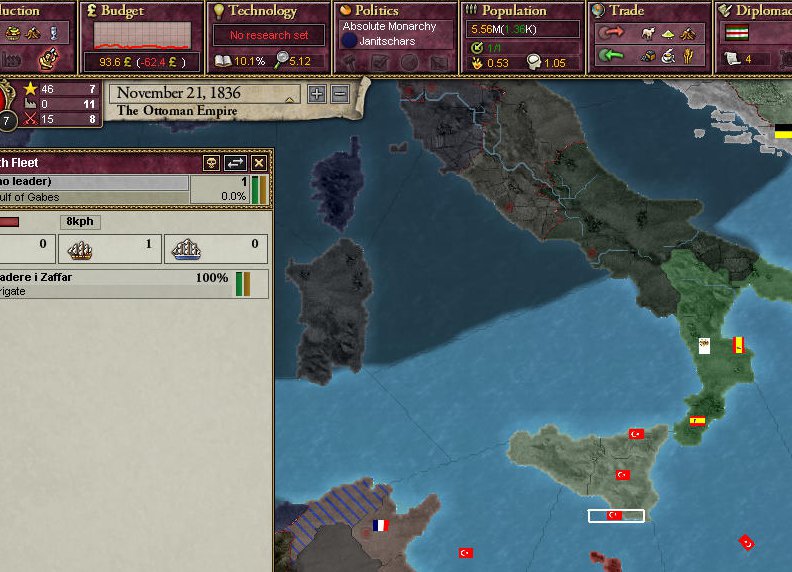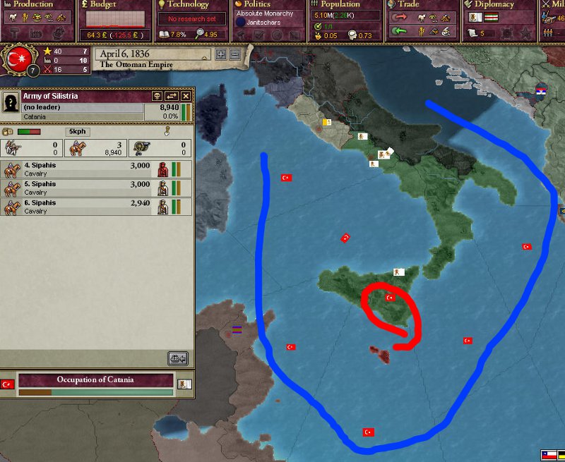 オスマントルコは総動員兵も輸送し順調にシチリア島の総動員兵を撃破するが、8月にはスペインが横取りしようと参戦。両シチリアは3ステート国家のため、順当に行けば自分が先に1ステートとって和平、次にスペインが1ステートで和平、残った首都ステート(人口1M近い!)を、先に和平した方が取れる計算になる(今回は和平条約を破ってはいけないルール)。