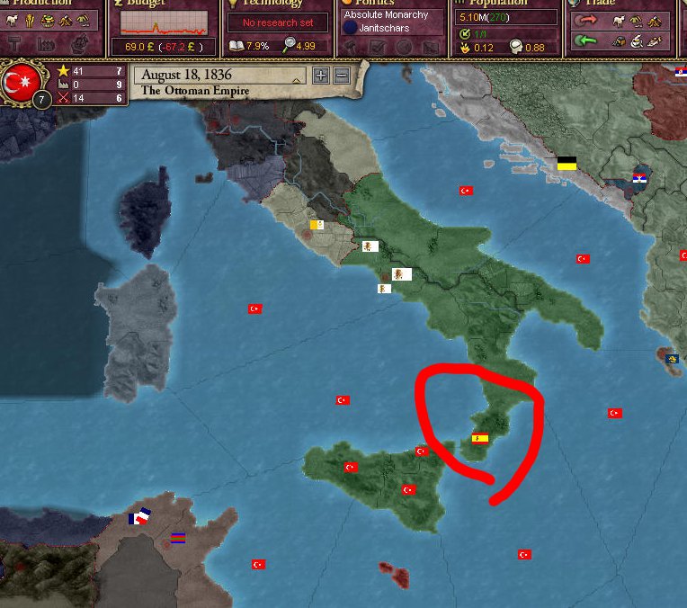小国の汎用国家戦略にも書いた通り、両シチリアは欧州唯一と言って良い、誰でも手出しでき、人口/Infamy比で美味しく、識字率の高い、宝のような国家。スペインが野心を剥きだしにしている今、先手必勝で取るしかないだろう。