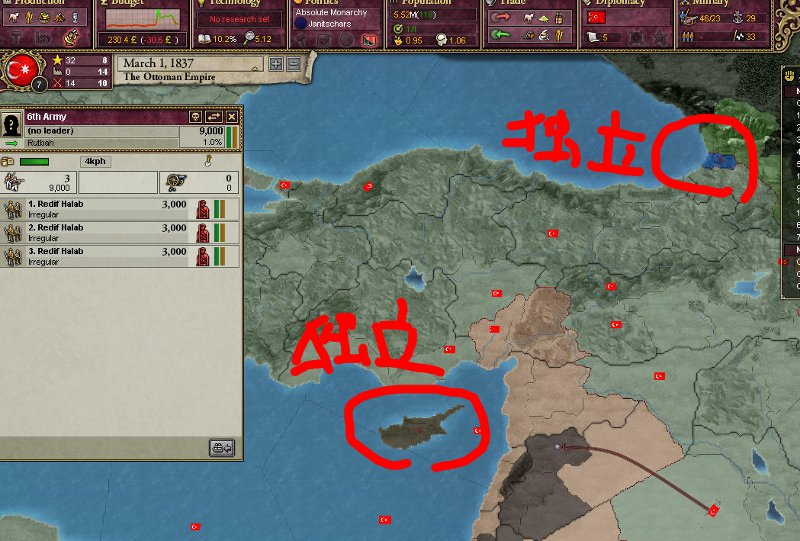 ……なのだが、ここで先ほどロシアに取られたKarsが効いてくる。オスマントルコは最初からアルメリアを独立させることができるが、初期領土から見ると3プロヴィンスなのでややもったいない。しかし、アルメリアの中核州のうちオスマンにある2プロヴィンスはKars所属なので、Karsを失った今独立させれば首都のみの1ステート国家で済む。これって得じゃね? ってことで、独立させてしまった(だからランクが下がるんだよ!)。これでInfamyが-5され、1841年には5を切ることになる。つまり、結局のところ、両シチリアは併合可能なのだ。