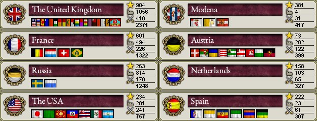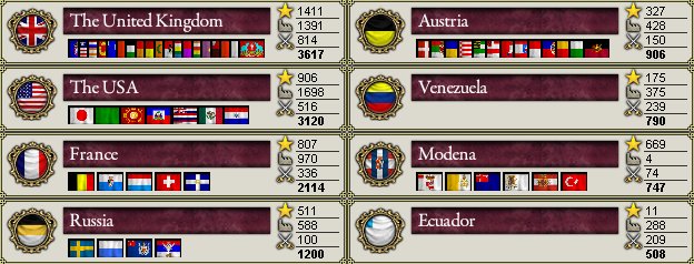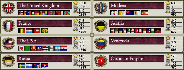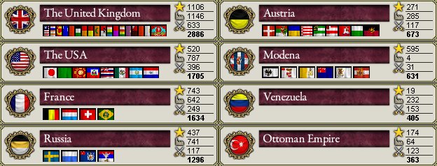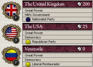 ちなみに、英国、USA、ベネズエラで政権交代があり、英国では国粋主義党(Nationalist Party)という反動主義政党が、USAでは共和党(Republican Party)という自由主義政党が、ベネズエラではLiberal Restaurador(自由再興党)という別の自由主義政党が政権与党となりました。