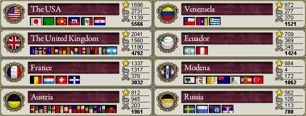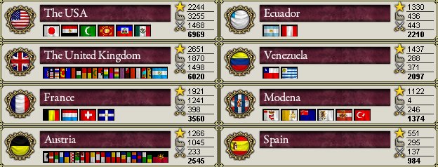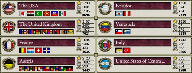そして、現在の列強の順位は以下のとおりです。今は我がイタリアの序列は7位ですが。何故か中央アメリカ連邦がスペインに代わって列強入りしています。