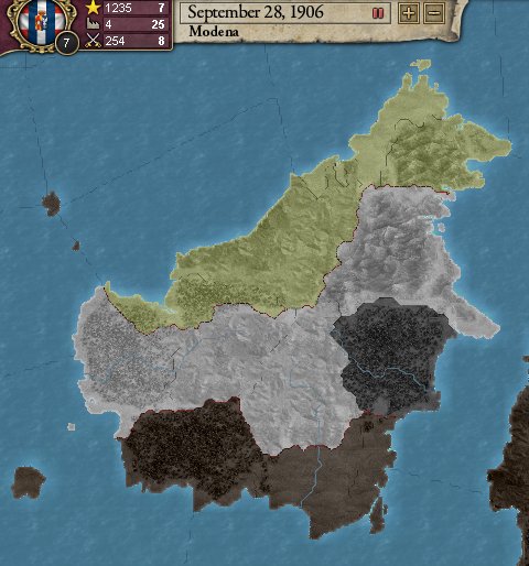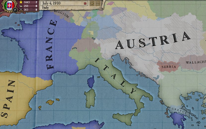 7月1日、オーストリアが我が国の和平提案を受け入れ、我が国はロンバルディアを獲得しました。同日、我が国は「進めイタリア!(Avanti Italia!)」を選択し、サルデーニャ・ピエモンテ、両シチリア王国、教皇領、トスカーナ大公国、ルッカは、「イタリアの風(Italian Winds)」で「イタリア国民よ永遠なれ(Long live the Italian people!)」と選択し、我が国への合邦に同意しました。