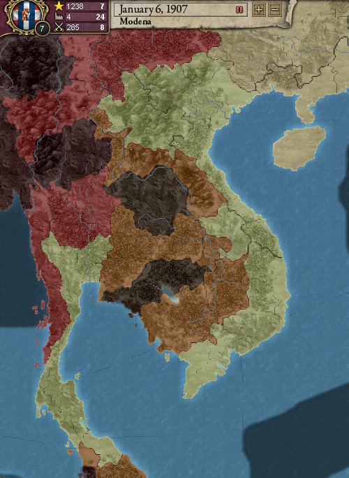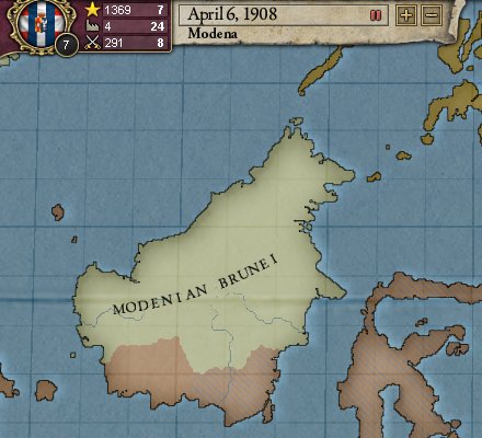 北ブルネイの植民地化が完了しました。NFを3つ設定できるようになっていたので、カリマンタン島の残りのMuraleve()と、東アフリカの現マハジャンガ州の東に続く東マハジャンガの植民地化にNFを設定します。